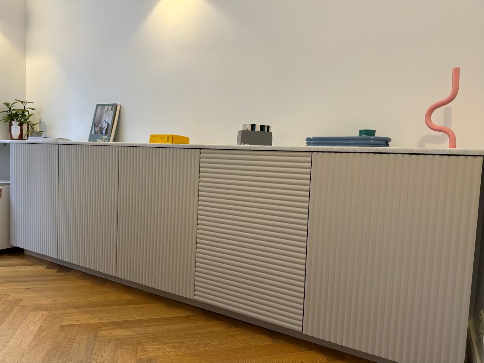 Le modèle Corniche intègre la poignée dans son design. Très élégant, l’alignement des portes et tiroirs permet de créer un rythme visuel dans votre intérieur.